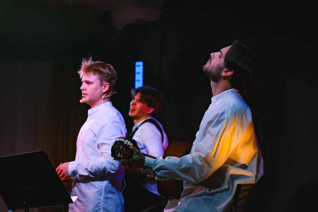Во-вторых, акустический аккомпанемент... Сильный голос и красивый тембр Олега Костыря прозвучит под музыку, исполненную на баяне, гитаре, и будет дополнен звучными, ритмичными ударными.