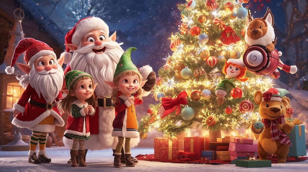 У входа малышей встречают весёлые Эльфы-помощники Деда Мороза, Снегурочка и озорной Тюбик. Они помогают детям пройти через весёлые задания и игры: