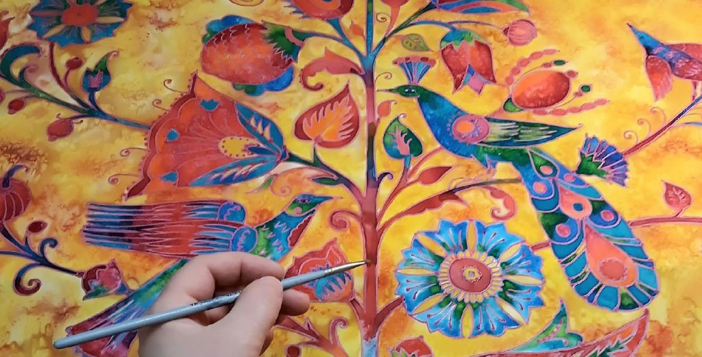 Под руководством известного московского художника по тканям Елены Клименко расписываем панно размером 65×65 см с готовым контурным рисунком в технике холодный батик. В процессе участники мастер-класса освоят приёмы росписи по сырой и сухой ткани, эффекты с солью, узнают много нового о декоративном подходе в батике. Выбор цветовой гаммы росписи — на своё усмотрение. Готовую работу можно использовать как панно на стену или, сняв с подрамника и подшив края, как платок. Роспись красками для батика по натуральной ткани (шёлк+ вискоза). Мотив росписи «Древо жизни» является одним из самых древних образов, отражающих представление человека о структуре Мира и встречается во многих культурах. Много лет занимаясь батиком, Елена Клименко часто изображает этот образ в своих работах. Участникам предоставляются персональные оборудованные рабочие места, краски, необходимые инструменты. Елена Клименко — художник, создающая сказочные образы на ткани. Работает в авторской технике, которая объединяет горячий батик, вытравку, графику по цветному и белому сатину. Родилась в Туле в 1974 году. Окончила Тульский колледж искусств им. Даргомыжского (отделение «живопись») и ТулГУ (графический дизайн). Прошла полный курс авторского батика в Центре батика Сергея Давыдова. Член Творческого союза художников России. 30 лет преподает живопись и батик. Участник персональных и коллективных проектов в стране и за рубежом. Получила гран-при в категории «Текстиль» на международной выставке-конкурсе современного искусства «Талант России 2022».