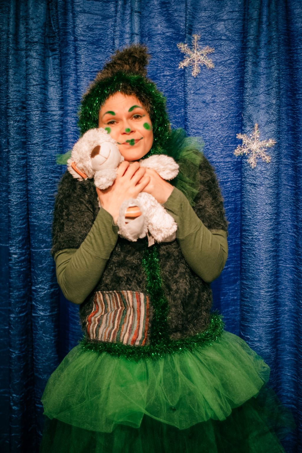 Но вот однажды она открыла глаза, смахнула снежинки со своих зелёных ресничек, откинула снежное одеяло и отправилась в город, чтобы пригласить детей на новогодний праздник...