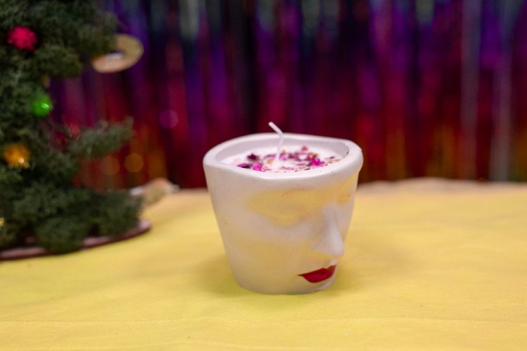 Вы раскрасите гипсовое кашпо. Внутри кашпо создадите восковую свечку. Задекорируете поверхность свечки, добавите отдушку.