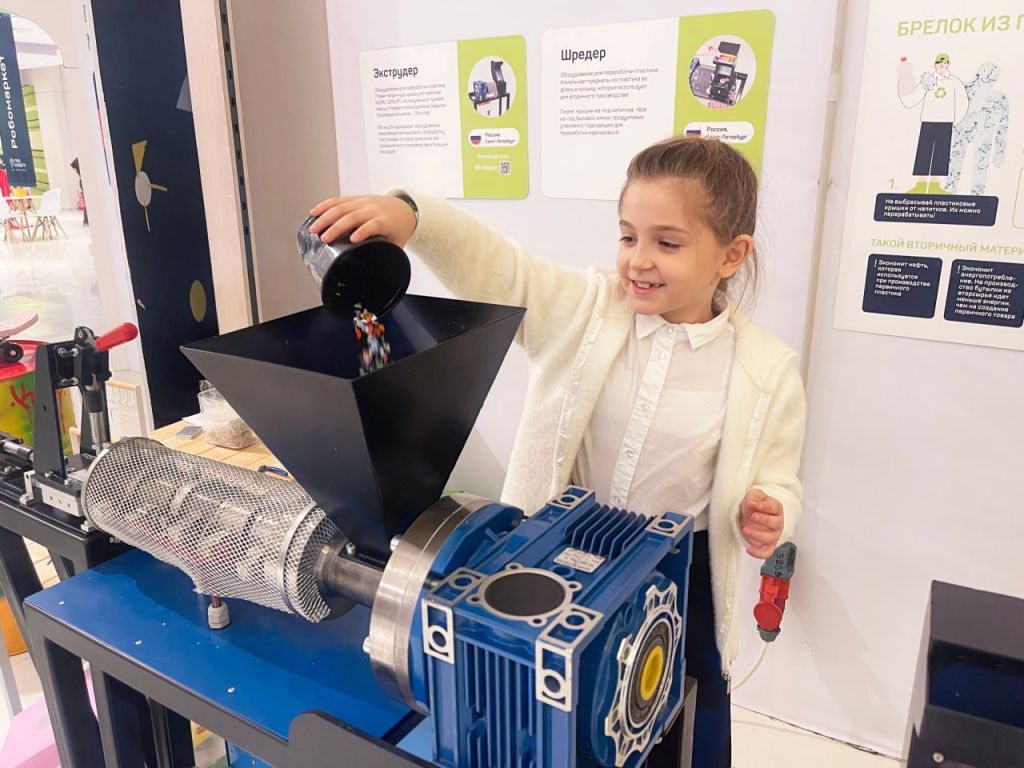 Какое же будущее без зелёных технологий? Посетители «Города будущего» не только увидят дизайнерские вещи из переработанных материалов: от кроссовок из шин и платья из скисшего молока до стульев из упаковки йогурта, от плащей из старых баннеров до бокалов из битого стекла, но и поучаствуют в процессе переработки пластика.