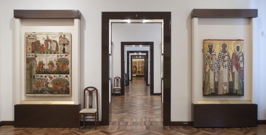 В двух залах экспонируются выдающиеся по своим художественным достоинствам и почти полной сохранности ансамбли новгородских иконостасов середины XVI в. — церкви Апостолов Петра и Павла в Кожевниках и собора Рождества Богородицы Антониева монастыря.