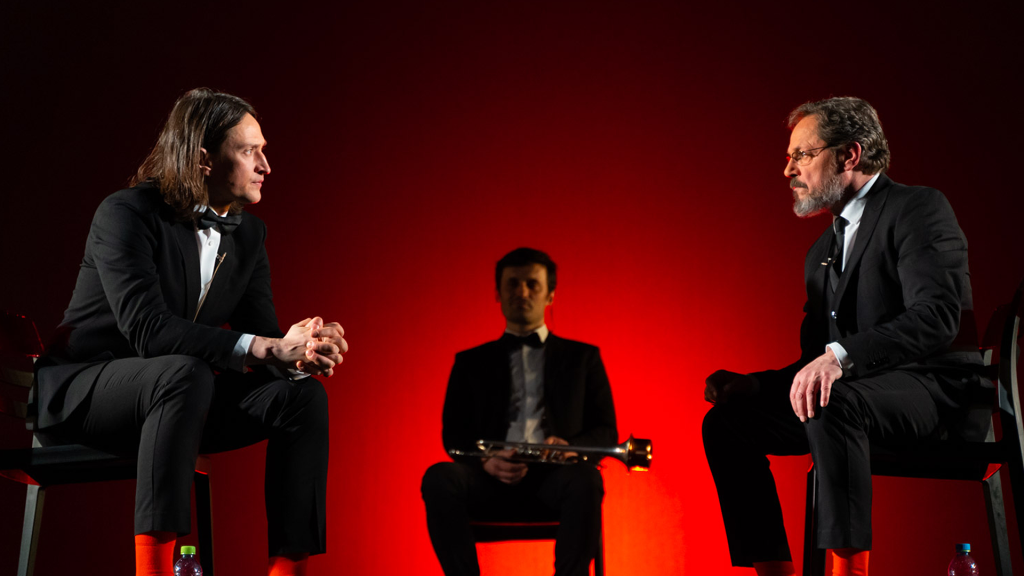 Спектакль лауреата «Золотой Маски», премии «Сноб-2020», и Total Theatre Award Юрия Муравицкого. «Человек живет абсурдно», — писал легендарный польский драматург Славомир Мрожек. Его «Эмигранты» в середине 20-го века стали олицетворением времени и оказались удивительно актуальны в начале века 21-го. В постановке Юрия Муравицкого герои пьесы в исполнении Игоря Скляра и Юрия Чурсина становятся участниками остросюжетного театрального телешоу. Они темпераменты и непримиримы и бесконечно спорят о том, кто прав! Они из разных поколений, да просто — из разных миров! Но есть то, что их объединяет. Они — эмигранты. Смех и слезы, товарищество и предательство, тоска по Родине и мечты о лучшей жизни, ирония и искренность — все в этом азартном споре, в финале которого нет и не может быть победителя. Телевизионное шоу — метафора вечного выбора человека: жить просто или сложно? Но ответа нет. В главных ролях: Юрий Чурсин, Игорь Скляр. Трубач: Иван Патрушев, Олег Чернов.