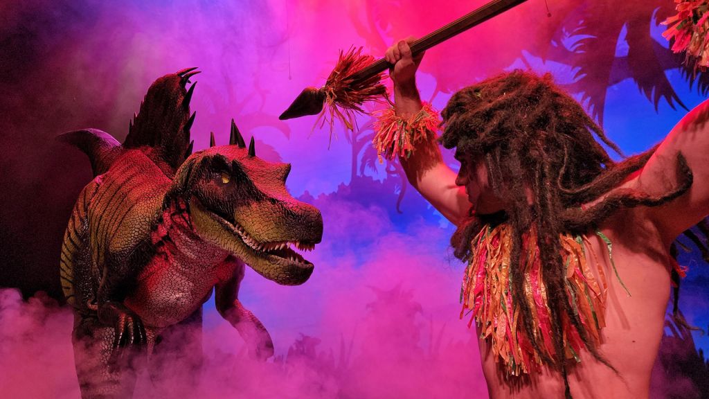 Шоу-спектакль «Сафари с динозаврами» — это увлекательное и опасное путешествие в мезозойскую эру — время больших и хищных динозавров! Захватывающие погони, неравная схватка с динозаврами, забавные танцы и песни туземцев, микс иллюзиона и цирка — все это в ужасно реалистичном и невероятно веселом семейном шоу-спектакле «Сафари с динозаврами»! Группа туристов, отправившись на экскурсию в долину фараонов, собирается совершить путешествие во времени. Они находят устройство, которое должно перенести их на несколько миллионов лет назад — в эпоху, когда в пустыне были непроходимые джунгли, а Землю населяли Супер-Люди. Однако одна малейшая ошибка в расчетах и программировании телепортатора приводит наших героев в компанию опасных существ и первобытных аборигенов... Продолжительность: 1 час 10 минут без антракта