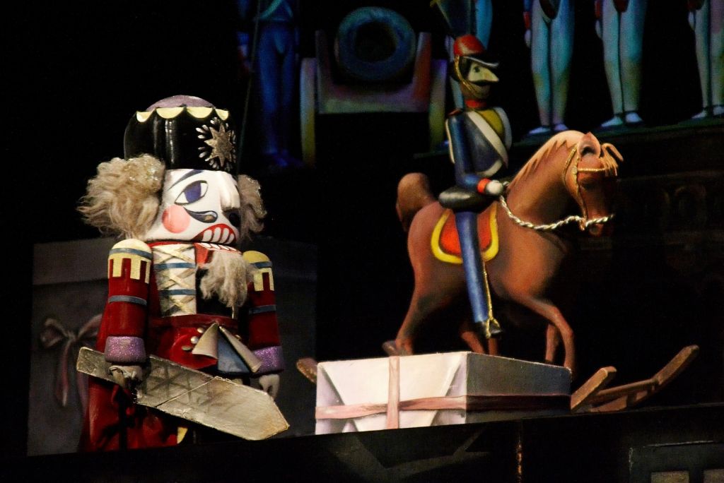 В одном сценическом пространстве существуют ночной город с рождественскими елочками в горящих окнах и крошечная гостиная в доме Штальбаумов, в которой танцуют нарядные гости; та же гостиная, но странно изменившаяся и ставшая в десятки раз больше; детская комната, которая становится ареной военных действий с батальными сценами и войском игрушек, до поры до времени стоявших в шкафу; Марципановое королевство с дворцом принцессы Пирлипат, а также таинственный Автор, который становится то маленьким, то большим, то и вовсе крошечным.