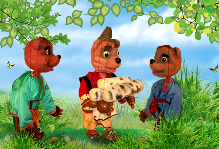 Музыкальный спектакль с участием кукол-марионеток по сказкам, басням и рассказам Л. Н. Толстого: о том, как весёлые медвежата Мишутка и Гришутка, примерно учась, всё-таки напроказничали дома и сбежали в лес от гнева папы-Медведя, где они заблудились и их поджидали опасности и… необыкновенные приключения.