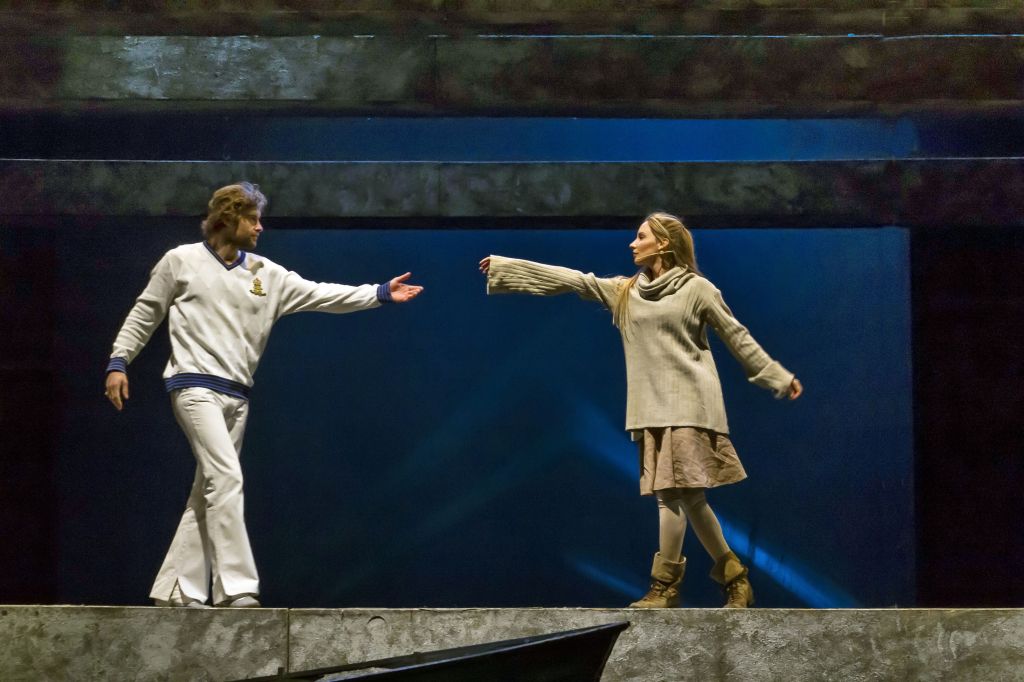 Знаменитую повесть-феерию Александра Грина поставил Раймундас Банионис, сын великого литовского артиста Донатаса Баниониса. Песни к спектаклю написал композитор Фаустас Латенас, многие годы создающий музыкальное оформление к театральным шедеврам Эймунтаса Някрошюса и Римаса Туминаса. Декорации не блестят и не мигают. Зрители попадают в прибрежную деревушку. Туда, где море встречается с небом, где рыбаки и моряки поют залихватские куплеты, а юная Ассоль ждет своего капитана Грея. Конечно же, в финале появляется фрегат с алыми парусами — парусами надежды. «Алые паруса» — удивительно тонкая, точная и яркая постановка о том, что каждый, независимо от возраста, может вырваться из повседневной суеты и исполнить свои мечты. И в этом нет никакого волшебства — надо только верить в чудо!