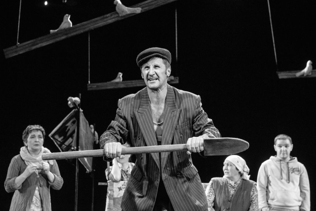 Спектакль идет на татарском языке. Любовь и голуби в исполнении кариевцев — это адаптированная театрализованная версия легендарной комедии Владимира Меньшова, снятой в 1984 году на киностудии Мосфильм. Сценарием послужила небезызвестная пьеса театрального актёра Владимира Гуркина, написанная тремя годами раньше. В её основу, кстати, легла вполне реальная история семьи Василия и Надежды Кузякиных, живших некогда в Иркутской области. Сюжет нестареющей лирической комедии знаком каждому зрителю и любим всеми: Василий после полученной на работе травмы едет поправлять здоровье в санаторий, где встречает Раису Идрисовну — роковую женщину своей провинциальной жизни. С курорта герой возвращается, разумеется, уже не в деревню, а прямиком в квартиру Раисы — такой загадочной и харизматичной. Кажется, в новых отношениях есть всё, чего так не хватало Василю: романтика, неизведанность, страсть, но нет уюта и дома, где остались Надя, хоть и считающая мужа баламутом и шалопаем, но всё же любимая, остались дети и милые сердцу голуби…