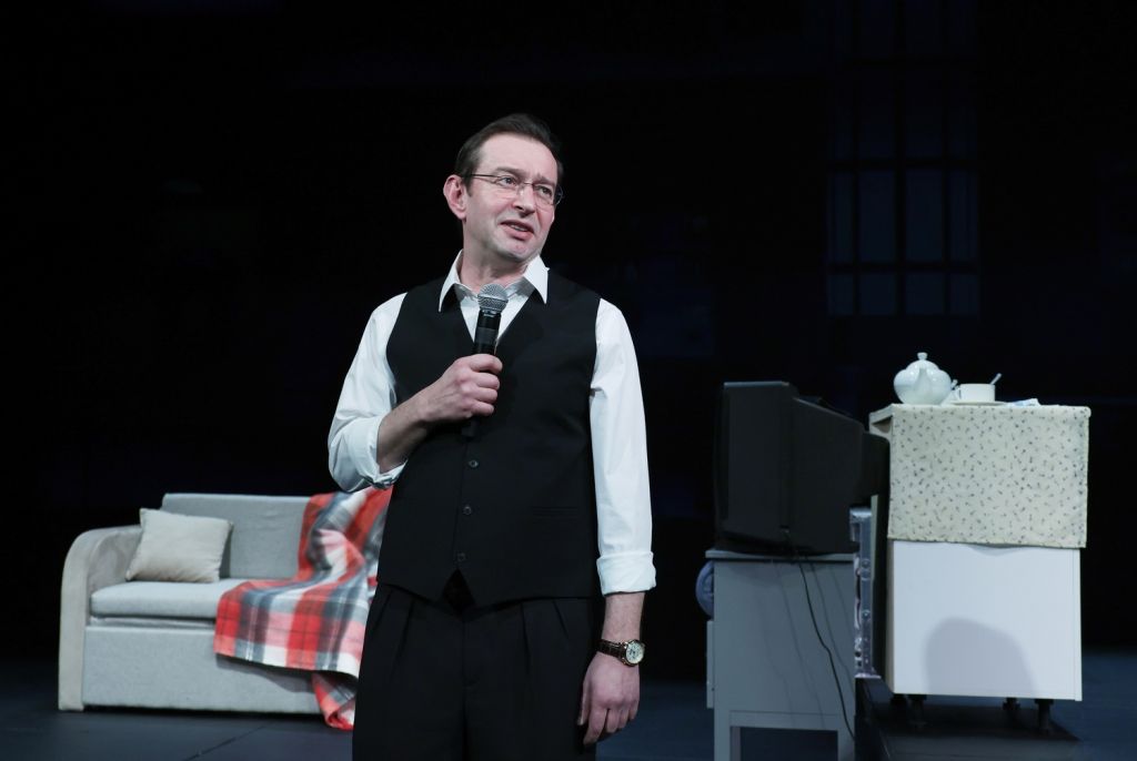 В спектакле 24 героя: 18 человек, 2 крысы, 2 попугая, кот и пёс — все они живут в одном доме.