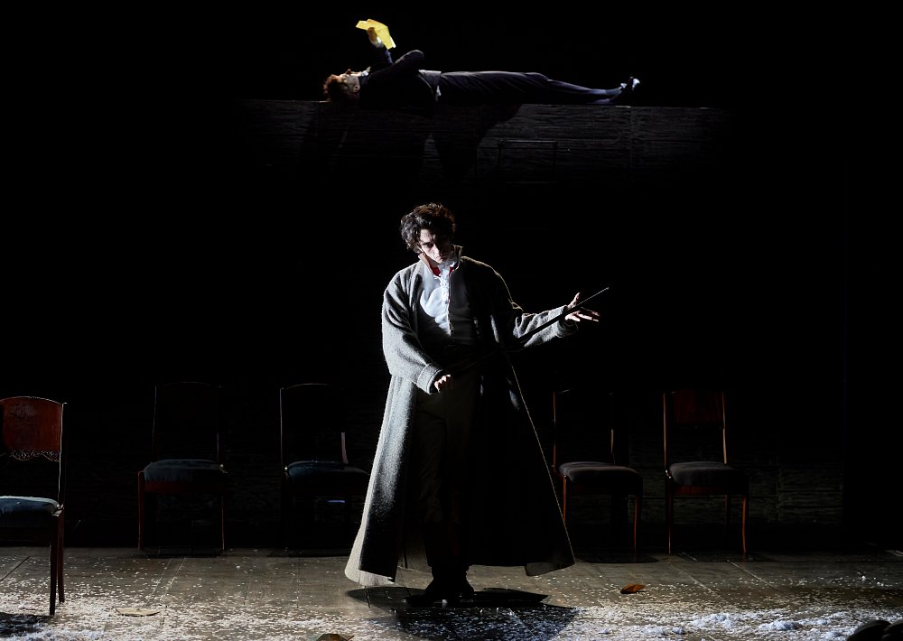 Создатели спектакля продолжают исследовать природные стихии на сцене. В декорациях разные состояния воды проявляют летучесть авторского слога и переменчивость главного героя. Снег то укутывает сцену перинами, то трещит морозами, то превращается в капель. Флешбэки, сны, размышления о прошлом меняют линейный ход истории и заставляют заново знакомиться с хрестоматийными героями. Этот «Евгений Онегин» рассчитывает на диалог со зрителем, хорошо знающим первоисточник и способным оценить хулиганства Пушкина на сцене.