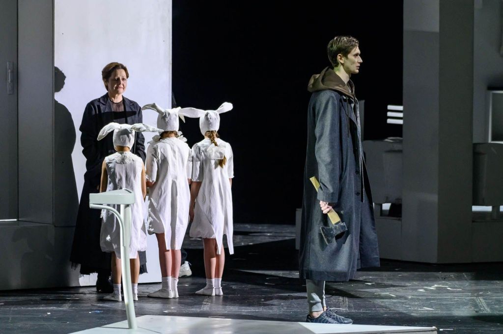 Подробное пятичасовое исследование их идей Родионом Романовичем сродни движению открытого сверхвосприимчивого сознания по многообразному палимпсесту стилей, толкований и жанров петербургского романа. Вместе с тем в нём нет привязанности к конкретной топографии. Среда спектакля максимально абстрактна и может принимать совершенно разные формы, то отсылая к изобразительной геометрии модернистов, то попросту превращаясь в мир, образованный исключительно острыми углами. Но части этого масштабного, в чём-то умозрительного пазла в финале собираются единым взглядом главного действующего лица — и не без отсылки к современному положению дел.