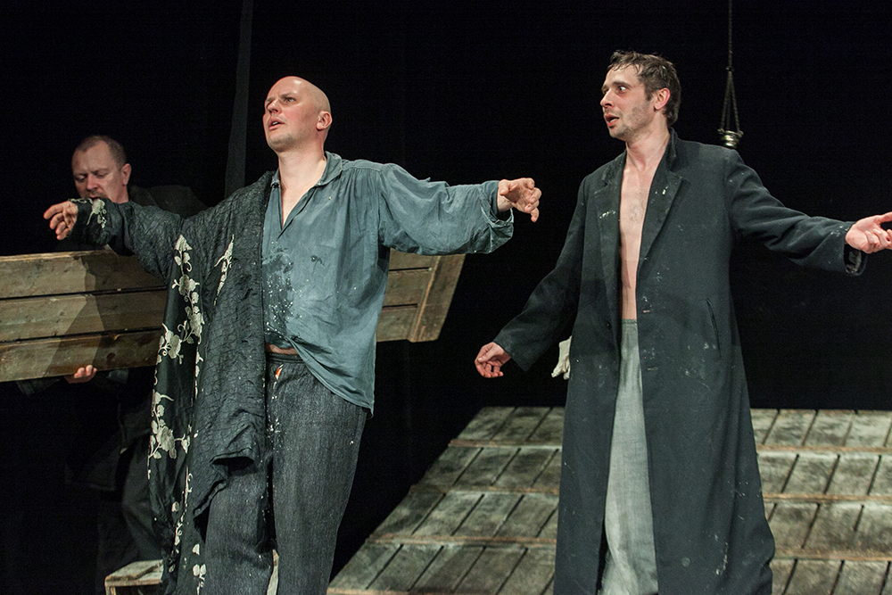 Знаменитая горьковская ночлежка лишается привычного смысла, превращаясь в абстрактный помост-плот, диковинный Ноев ковчег, на котором живут и выживают, странствуют, философствуя по пути, «люди и человеки». Босые чудаки, странные персонажи этой притчи ищут света, любви, спасения… Их дом – между небом и дном; их дни – безвременье; их жизнь – испытание, вечный спор с Богом, страдание и вместе с тем – величайшая ценность. Они мечтают о славном городе Иерусалиме, но ближе оказывается «золотой край» – Сибирь.