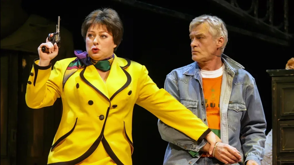 Комический эффект от всего происходящего усилен в спектакле приёмом «театр в театре», а зрители сделаны непосредственными свидетелями на процессе по «делу о супружеской неверности».