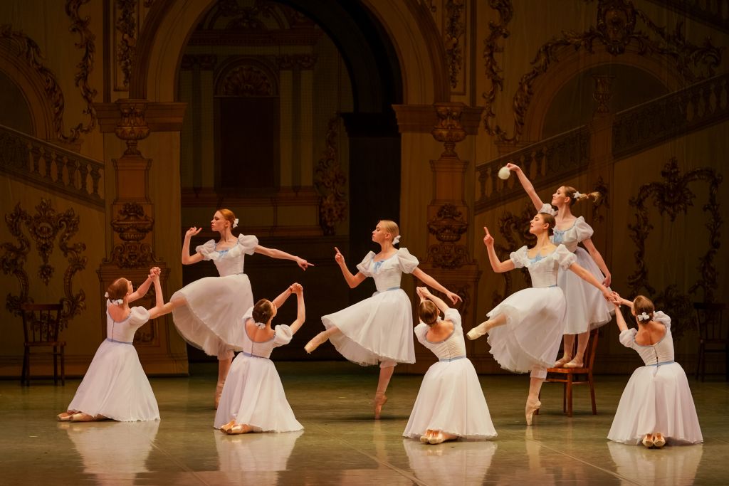 Занавес открывается, представляя парадную гостиную. Появляются воспитанницы, чтобы осмотреть помещение и подготовиться к балу. Все они взбудоражены, ведь на бал приглашены мальчики из офицерского училища. Затем появляется Директриса, которая приходит убедиться, что всё в порядке.