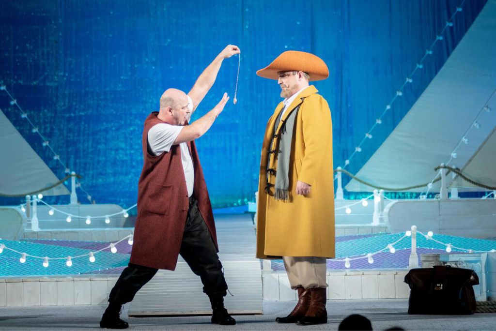 Действие спектакля разворачивается в фантастическом неаполитанском порту. Декорации изображают причалы с пришвартованными кораблями и облака, создавая яркую, живописную картину, погружающую зрителя в атмосферу приморского города.