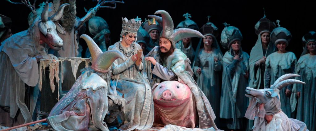С тех пор «Сказка о царе Салтане» – бестселлер для родителей с детьми. Взрослые идут, чтобы услышать замечательных солистов оперы (в постановке даже в небольших партиях всегда заняты лучшие силы театра), а детей ждет незабываемое рукотворное представление: всех персонажей в царстве Тмутаракани и на острове Буяне – от ангелов, рыб и коров до деревьев и самого города – играют артисты хора и миманса в изобретательно придуманных костюмах.