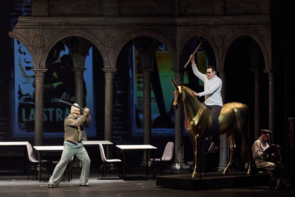 «Бенвенуто Челлини», с его многолюдными уличными сценами, попойкой в таверне, балаганным театром, римским папой в качестве Deus ex Machina и прочими эффектными ситуациями, предоставляет любому оперному режиссёру заманчивое поле деятельности. Московский постановщик Алексей Франдетти увидел параллели между историей создания легендарной статуи Персея и историей съёмок культового фильма Федерико Феллини «8½». Режиссёр перенёс действие оперы в 1963 год, на римскую киностудию, где, как известно, с большими трудностями рождался величайший киношедевр ХХ века. Кризисы и прозрения, чередование прокрастинации и лихорадочной деятельности, финансовые «качели» и зависимость от заказчика сопутствуют художественному творчеству в любые времена.