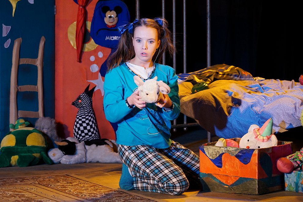 Границы между сценой и залом, между артистами и детьми в спектакле почти нет: дети сидят на разноцветных подушках, но могут подойти к сцене — и здесь танцевать, петь, прятаться от воображаемого дождя под зонтом. А главное — дети могут помочь девочке, главной героине спектакля, найти потерявшуюся куклу.
