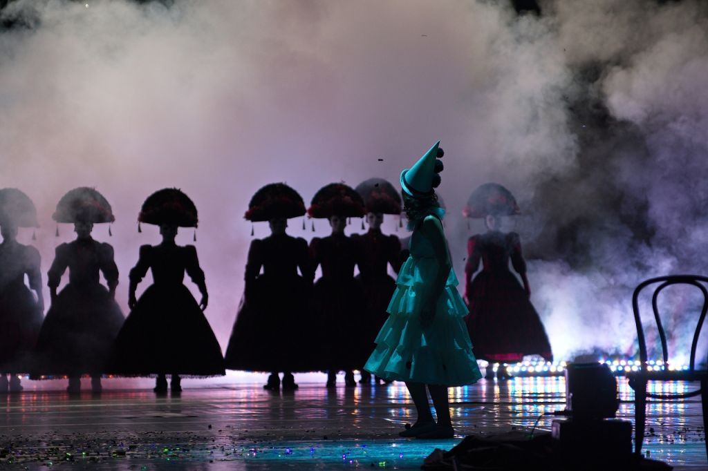 Мы много спорили с художником Максимом Обрезковым о том, как должна выглядеть эта история. В конце концов возникли два образа, важных для нашей постановки — зеркало и маска. Зеркало — это совершенный портал в другой мир. А маска — это Италия, отсылка к старым итальянским постановкам. С масками соседствуют современные костюмы. На сочетании этих временных полюсов и строится спектакль. Происходит соединение современного и архаического театра».
