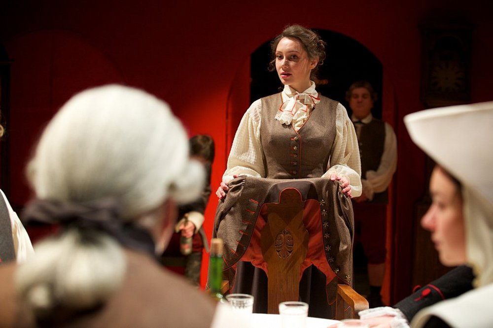 В пространстве художника Сергея Бархина — в шестиграннике-амфитеатре, покрытом алым бархатом — пройдет обед философа Иммануила Канта. Точнее спектакль-обед. О чём пойдет речь? В Кенигсберге безоблачное небо и все хорошо. Точнее, плохо: с природой что-то не то, не улетают птицы и не опадают яблоки. У Канта традиционный обед с гостями: как известно, Кант выработал некие правила обеда и застольной беседы — шутка способствует пищеварению, застольная беседа — великое искусство и не надо перескакивать в диалоге с одного предмета на другой, разговор должен быть ровным, без страстей и так далее. В этом искусстве компании нет равных.