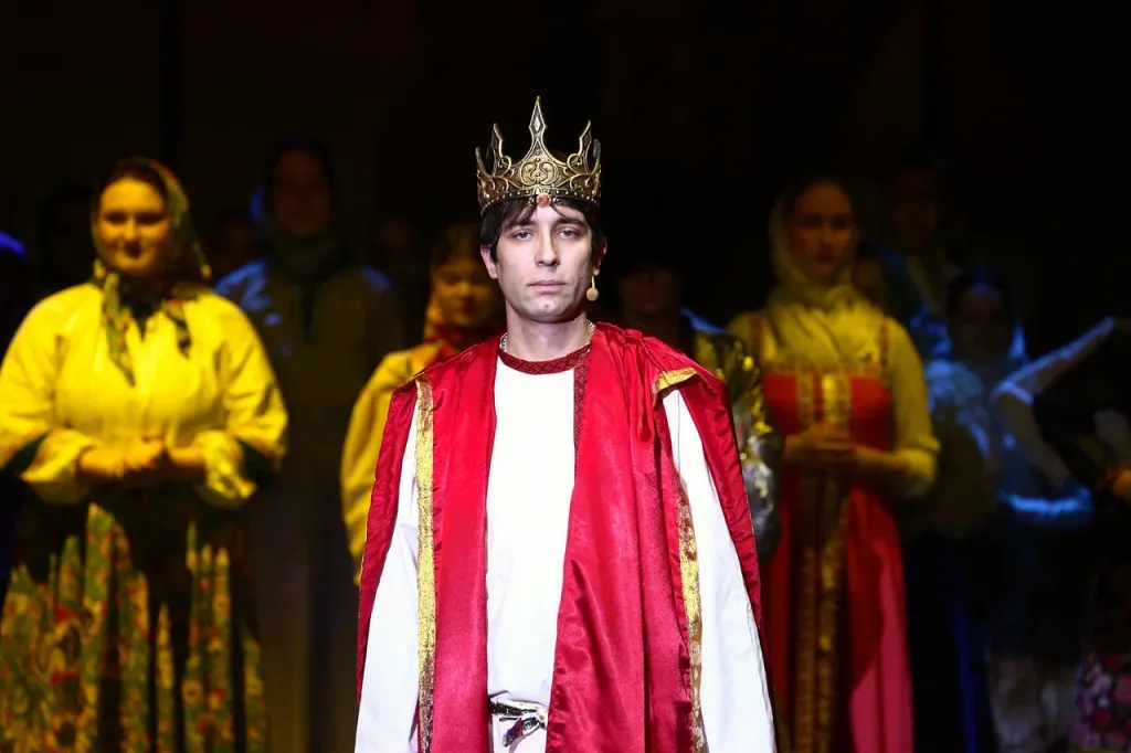 С помощью выразительных ходов режиссер Вячеслав Спесивцев превращает сказку про царя Салтана и его сына Гвидона в необыкновенно точную и узнаваемую историю нашей Родины двадцатого столетия и до наших дней. Музыкальное решение спектакля — популярнейшие песни ХХ века — «Тачанка», «Летят перелетные птицы…», «Москва майская» — еще ярче подчеркивают колорит и самобытность спектакля. На сцене, как во времена Шекспировского театра, отсутствуют декорации, но с началом действия зритель об этом совершенно забывает – он уже увлечен интригами при дворе царя Салтана, он уже переживает за судьбу наследника и матери, и вместе с актерами всеми силами пытается помочь молодому князю Гвидону.