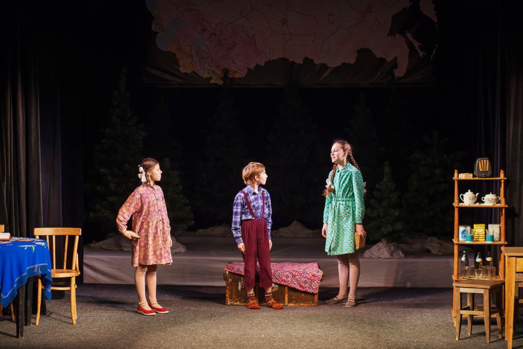 Будто на машине времени зрители попадают в канун нового 1956-го года — с советским радиоприёмником, с бюстами поэтов на старинной этажерке, с персонажами в красных галстуках. Сашка, Гена и другие фантазёры шагнули в спектакль прямиком из рассказов Н. Носова.