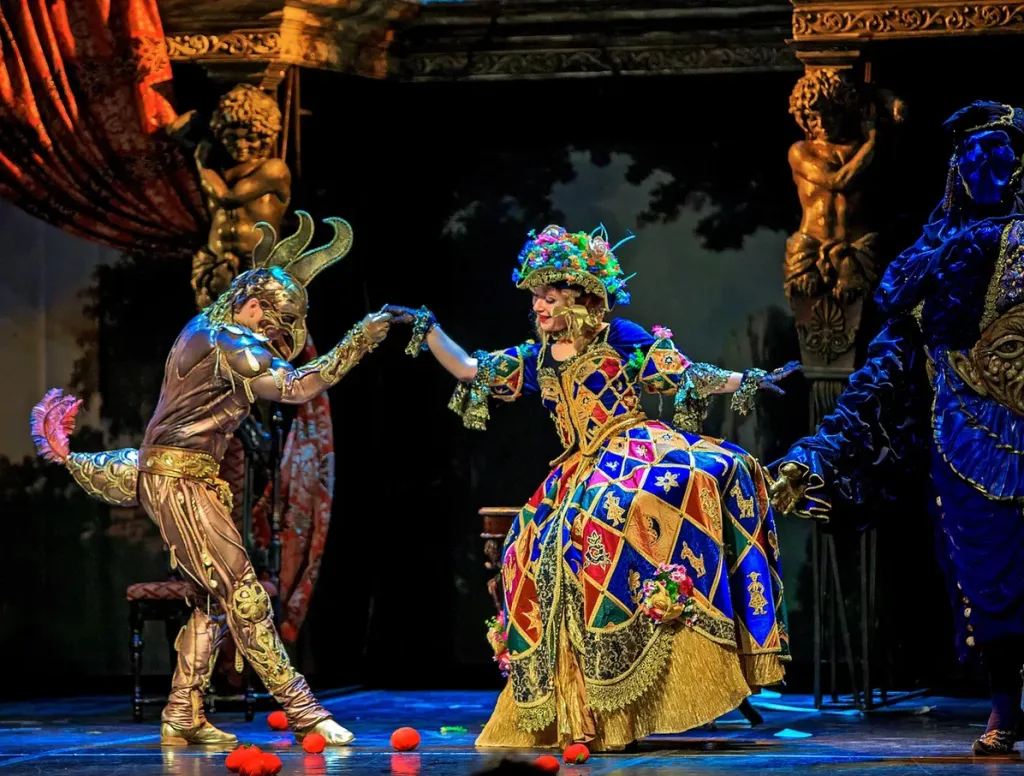 С помощью привлечения образов и средств комедии дель арте (старейшей театральной формы), режиссёр создал вневременную историю о жизни театра. В ней сценическая условность и внесценическая реальность столь неразрывно переплетены, что их невозможно отделить друг от друга. Жанры комедии и трагедии в этом спектакле пародируют друг друга, будничность обстановки в первом действии сменяется неистовыми красками и изысканно стилизованными костюмами во втором (художник-постановщик Вячеслав Окунев). Театральность как принцип существования господствует не только на сцене, но и выплёскивается в зрительный зал.