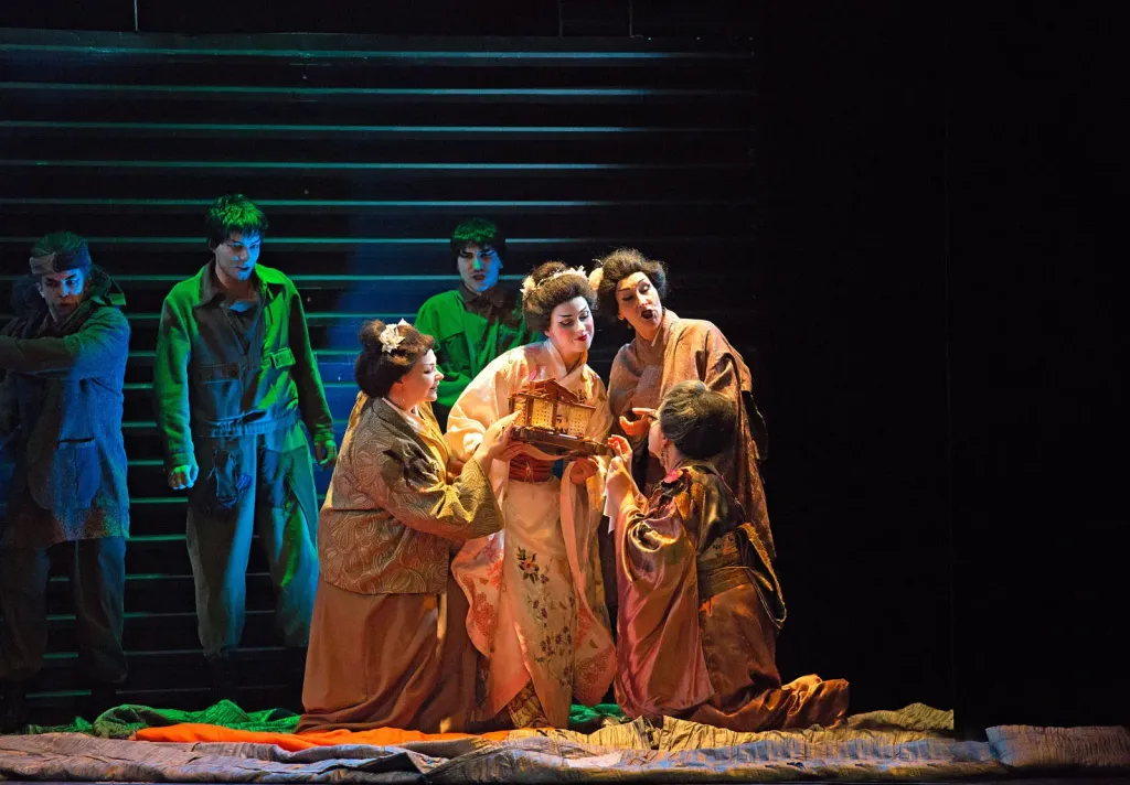 Обман Пинкертона, морского офицера, который женился на Чио-Чио-Сан, имея уже жену в США, и бросил свою японскую жену без сожалений, Юрий Александров сравнил для себя с гуманитарной помощью из Америки. По мнению режиссёра, природа этих отношений чудовищна. В конечном итоге взрыв нравственный в финале спектакля оказывается сильнее и страшнее ядерных взрывов в Хиросиме и Нагасаки.