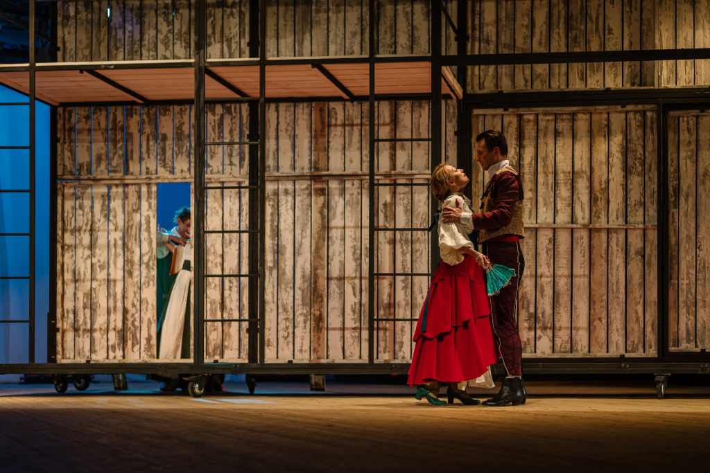Интрига любовного треугольника расцвечивается страстными испанскими песнями, зажигательным фламенко. Мулеты, шали, кастаньеты задают ритм всему спектаклю.