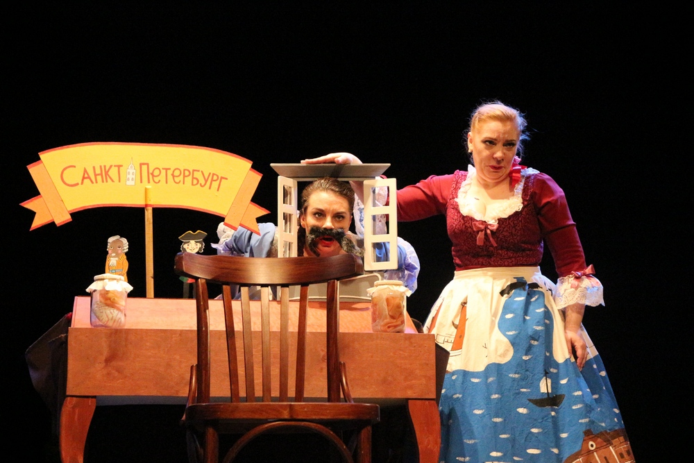 Классическая музыка, пластические решения, сочетание игры вживую и кукол, ожившие картины старых мастеров, роскошные парики и платья с кринолином — зримая эпоха Петра Великого.