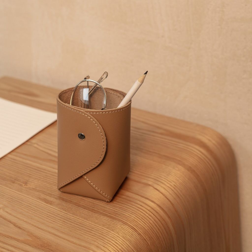 Tube — органайзер для канцелярских принадлежностей из натуральной плотной кожи «бюргер». Аксессуар имеет лаконичный дизайн: сложенная в форме конверта гладкая кожа с ровными строчками скреплена хольнитеном, а дно украшает аккуратный логотип Werf Home.