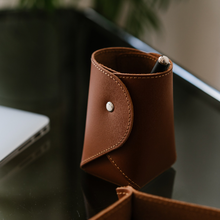 Минималистичное изделие из натуральной кожи прекрасно дополнит любой рабочий стол в офисе или дома.
