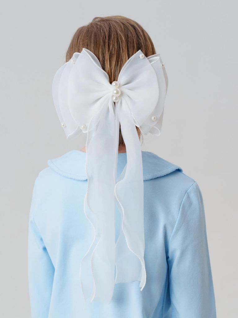 Большой бант-заколка из органзы с волнистыми краями с отделкой искусственным жемчугом выполнена вручную. За счет легкого и прочного крепления бант надежно крепится на прическе и станет модным аксессуаром в образе школьницы. Ширина банта 20см, длина банта 40 см