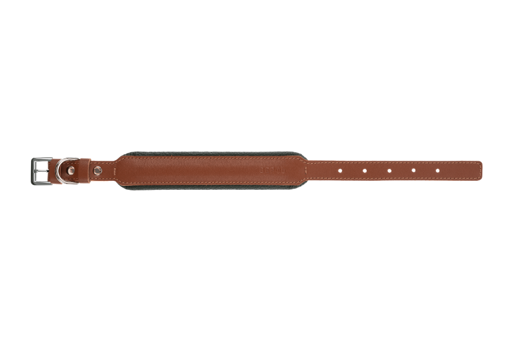 Прямой ошейник из натуральной кожи двух видов с мягкой подушкой. Подходит для небольших пород собак.