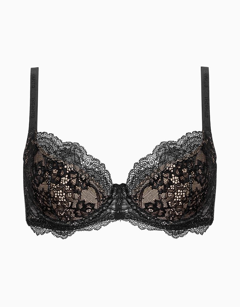 Бюстгальтер с мягкими чашками и усилителем из спонжа на стане. Верхняя часть чашек выполнена из тонких прозрачных материалов, что добавляет особую пикантность образу.