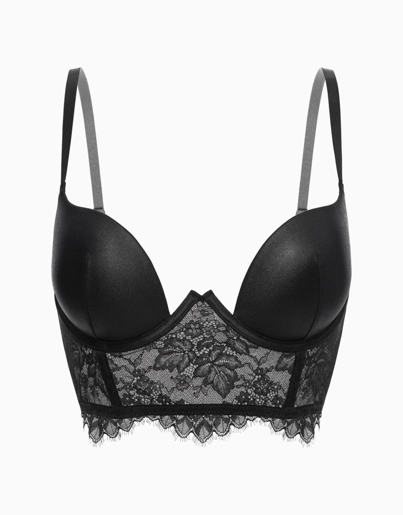 Бюстье Пуш-ап (в чашках A и В) с формованными чашками на стане. Чашки C и D без Пуш-ап. Открытые чашки с фигурным краем приподнимают грудь и собирают ее, создавая пленительную линию декольте.
