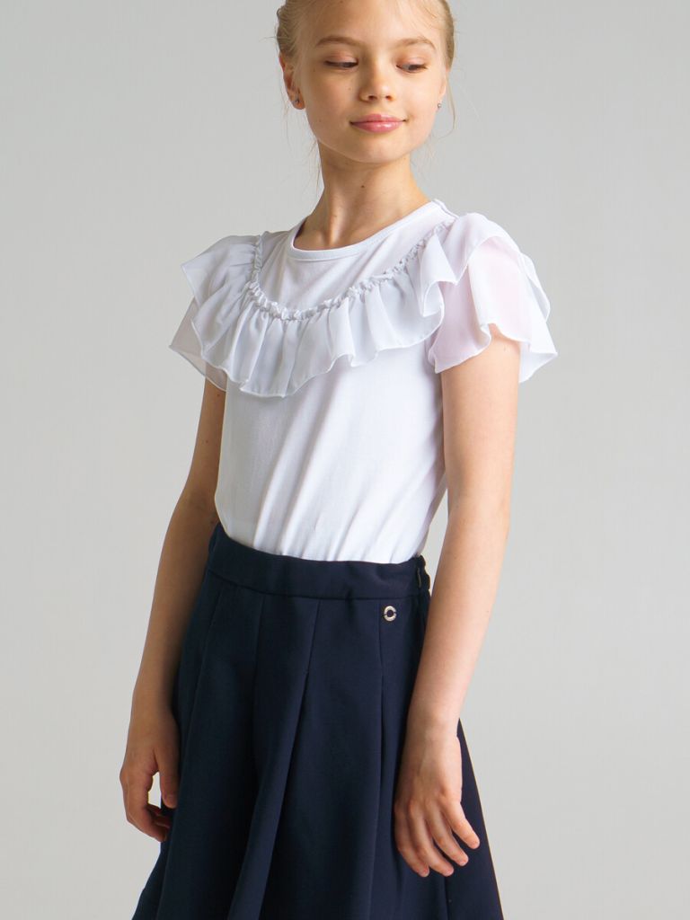 Белая нарядная трикотажная блузка прямого силуэта для девочки подростка - прекрасная альтернатива текстильной блузке или рубашке. Школьная блузка очень мягкая и приятная на ощупь, блузка хорошо держит форму, комфортна в носке и проста уходе. Высокое содержание хлопка 95%. Благодаря наличию эластана в составе ткани, изделие проще в уходе и держит форму. Блузка в школу с коротким рукавом и рюшей из шифона разнообразит повседневные образы школьницы.