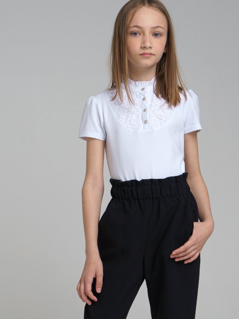 Белая нарядная трикотажная блузка прямого силуэта для девочки подростка - прекрасная альтернатива текстильной блузке или рубашке. Школьная блузка на кнопках очень мягкая и приятная на ощупь, блузка хорошо держит форму, комфортна в носке и проста уходе. Высокое содержание хлопка 95%. Благодаря наличию эластана в составе ткани изделие проще в уходе и держит форму. Блузка в школу с коротким рукавом и декором из кружева разнообразит повседневные образы школьницы.
