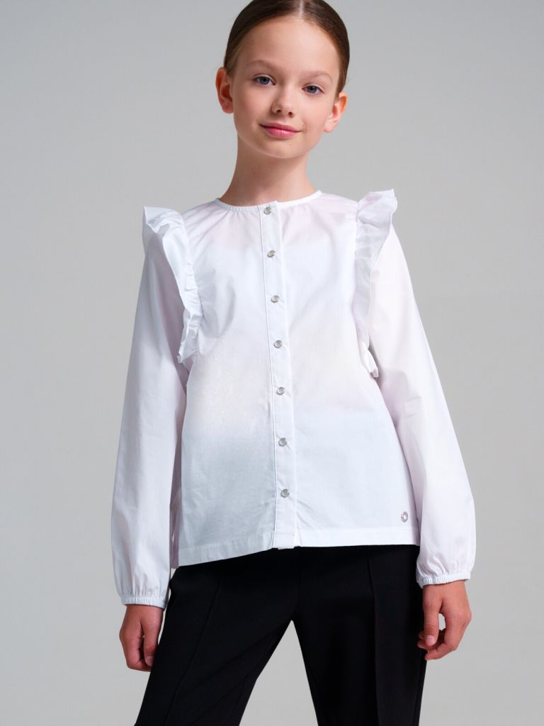 Белая нарядная текстильная блузка прямого силуэта для девочки подростка - прекрасная альтернатива трикотажная блузке. Школьная блузка на кнопках хорошо держит форму, комфортна в носке и проста в уходе. Высокое содержание хлопка. Рубашка в школу с длинным рукавом разнообразит повседневные школьные образы.