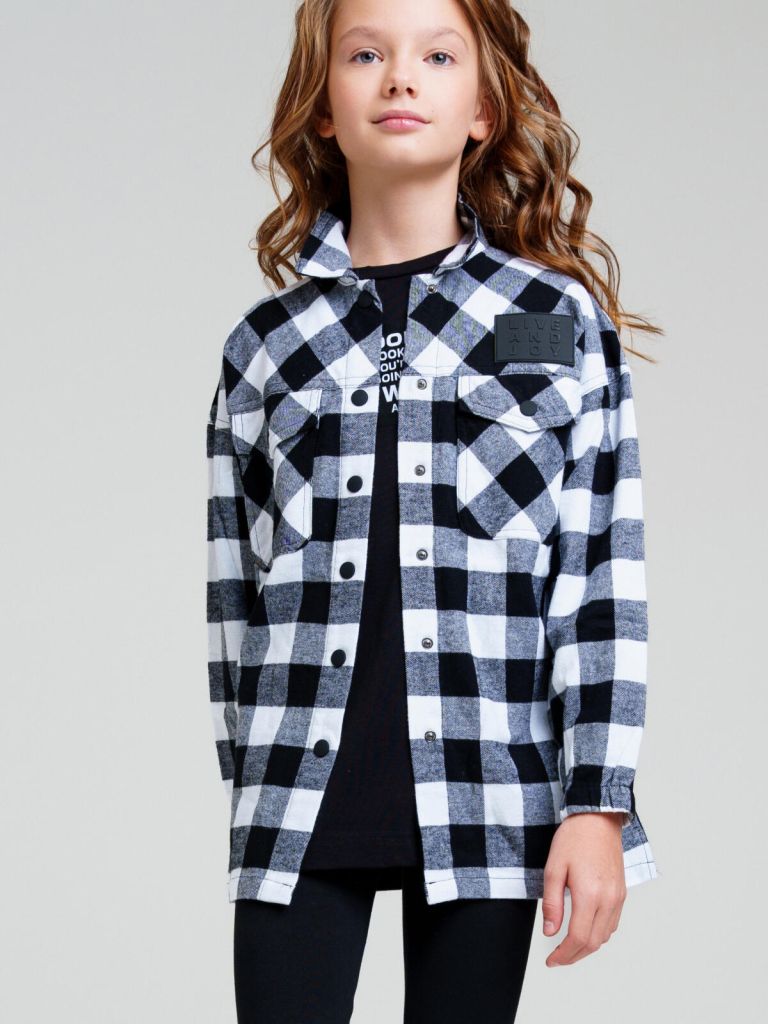 Фланелевая рубашка для девочки подростка. Оверсайз силуэт. Застежка на кнопки. Функциональные нагрудные карманы. Манжеты на резинке. Низ изделия с разрезами по бокам.