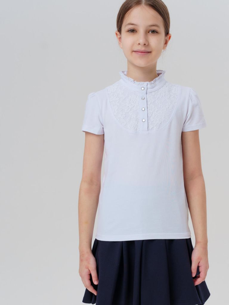 Эта нарядная белая блузка для школы с коротким рукавом подарит комфорт и уверенность на уроках, линейках и школьных праздниках. Материал — качественный трикотаж джерси с высоким содержанием хлопка — мягкий, гипоаллергенный и приятный на ощупь. Благодаря добавлению эластана блузка отлично держит форму, не вытягивается и легко переносит многократные стирки.