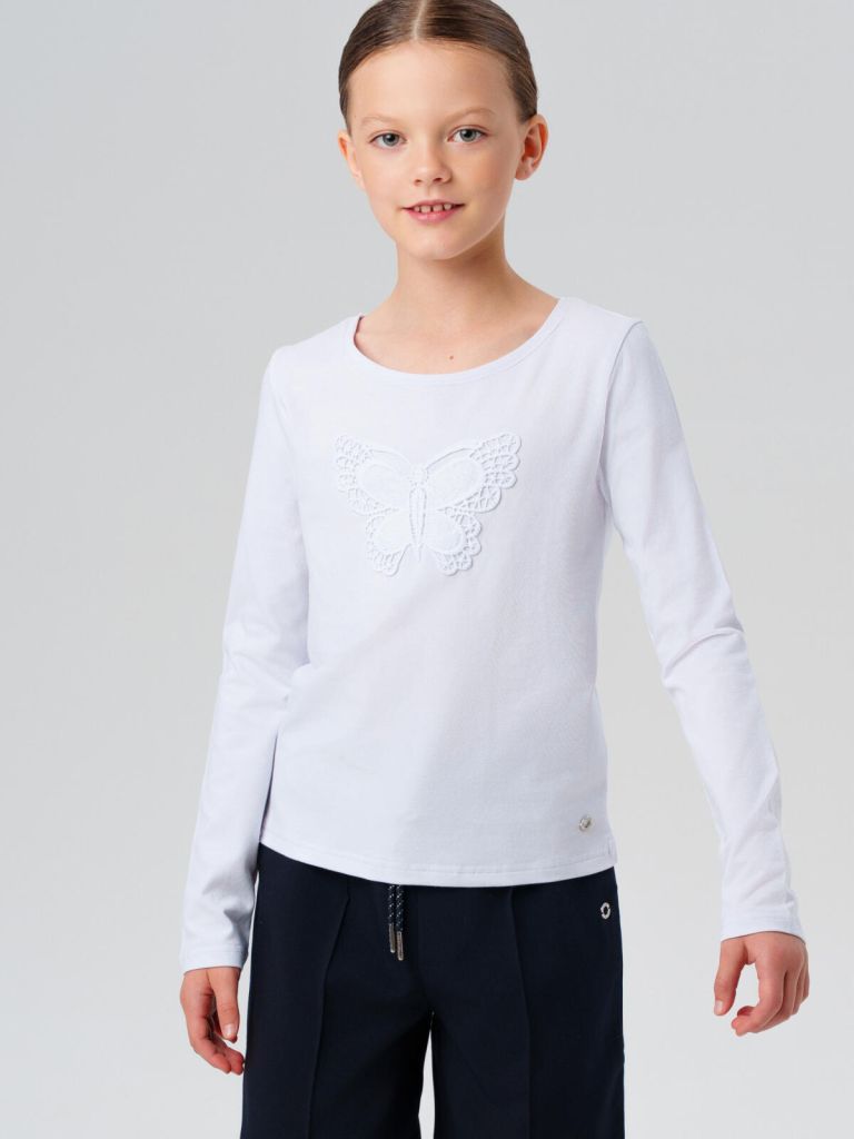 Эта белая трикотажная блузка для девочки станет прекрасной альтернативой классической текстильной блузке или рубашке. Материал с высоким содержанием хлопка мягкий, приятный на ощупь, позволяет коже дышать и сохраняет форму после множества стирок.