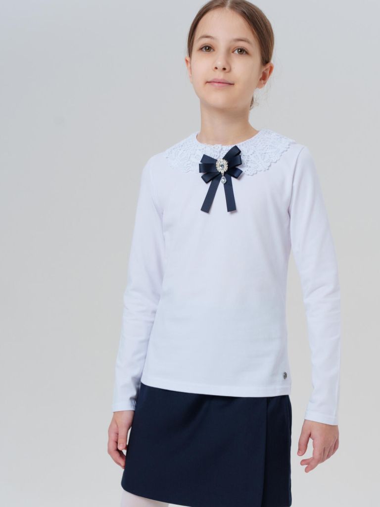 Эта блузка для девочки-подростка выполнена в аккуратном прямом силуэте, который не сковывает движений и красиво смотрится в школьных образах. Кружевной воротник с бантом придаёт нарядный акцент, а удобная застёжка сзади на пуговицу делает модель практичной и комфортной.