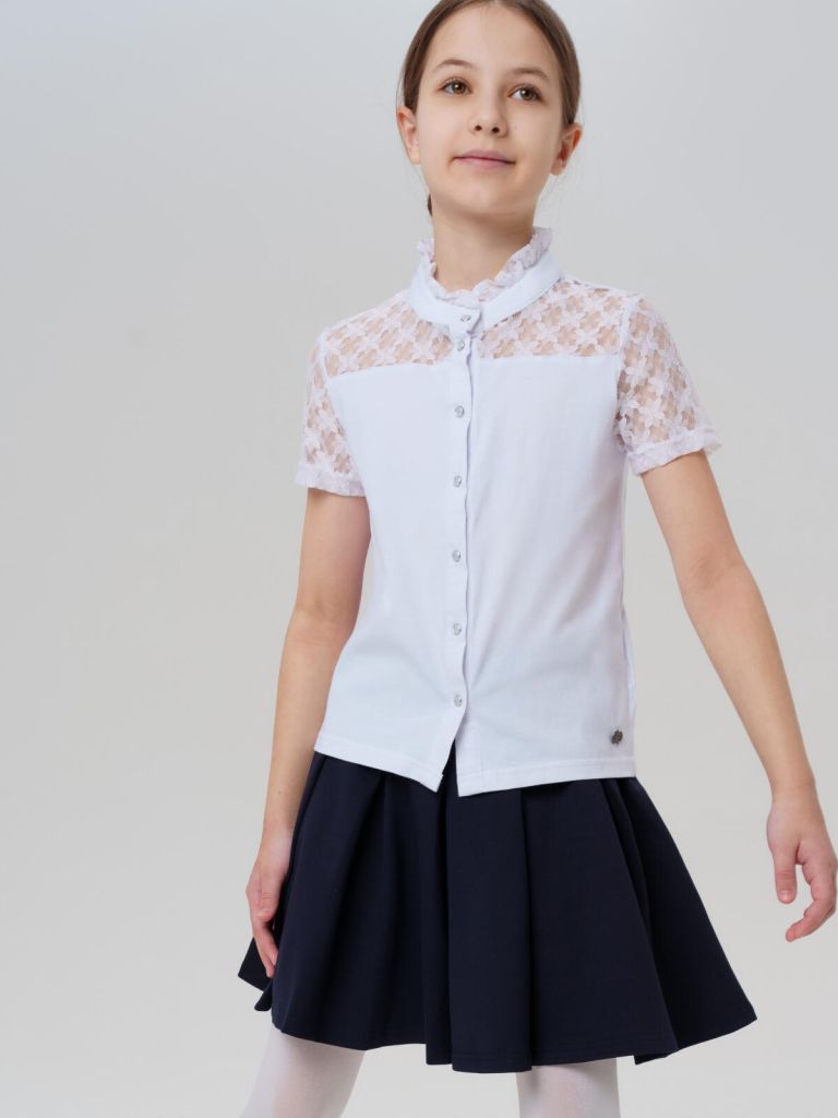 Аккуратный воротник из кружева добавляет образу нежный и нарядный акцент, делая модель уместной как для повседневных школьных будней, так и для особенных случаев. Застёжка на кнопках делает блузку удобной в использовании, а короткий рукав — идеален для помещений и тёплого времени года.