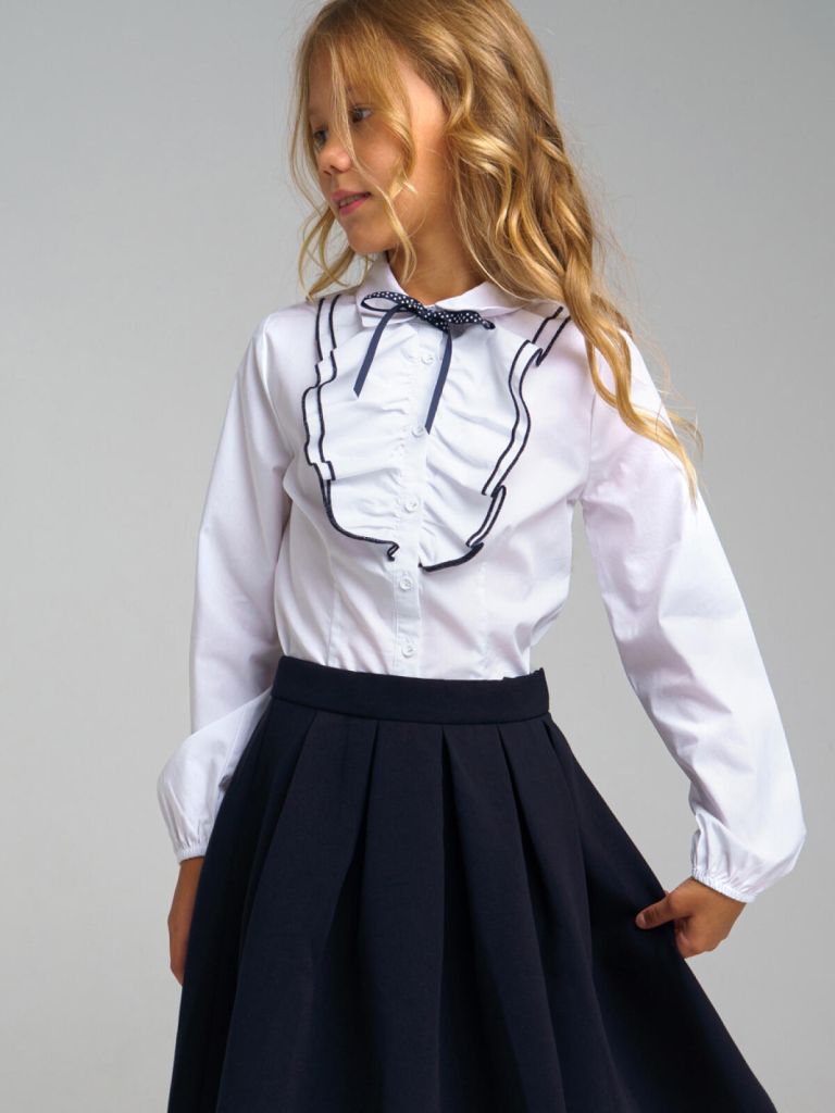 Белая нарядная текстильная блузка полуприлегающего силуэта, приталенная для девочки подростка. Школьная блузка на пуговицах хорошо держит форму, комфортна в носке и проста в уходе. Высокое содержание хлопка. Рубашка в школу с длинным рукавом и декоративной рюшей разнообразит повседневные школьные образы.