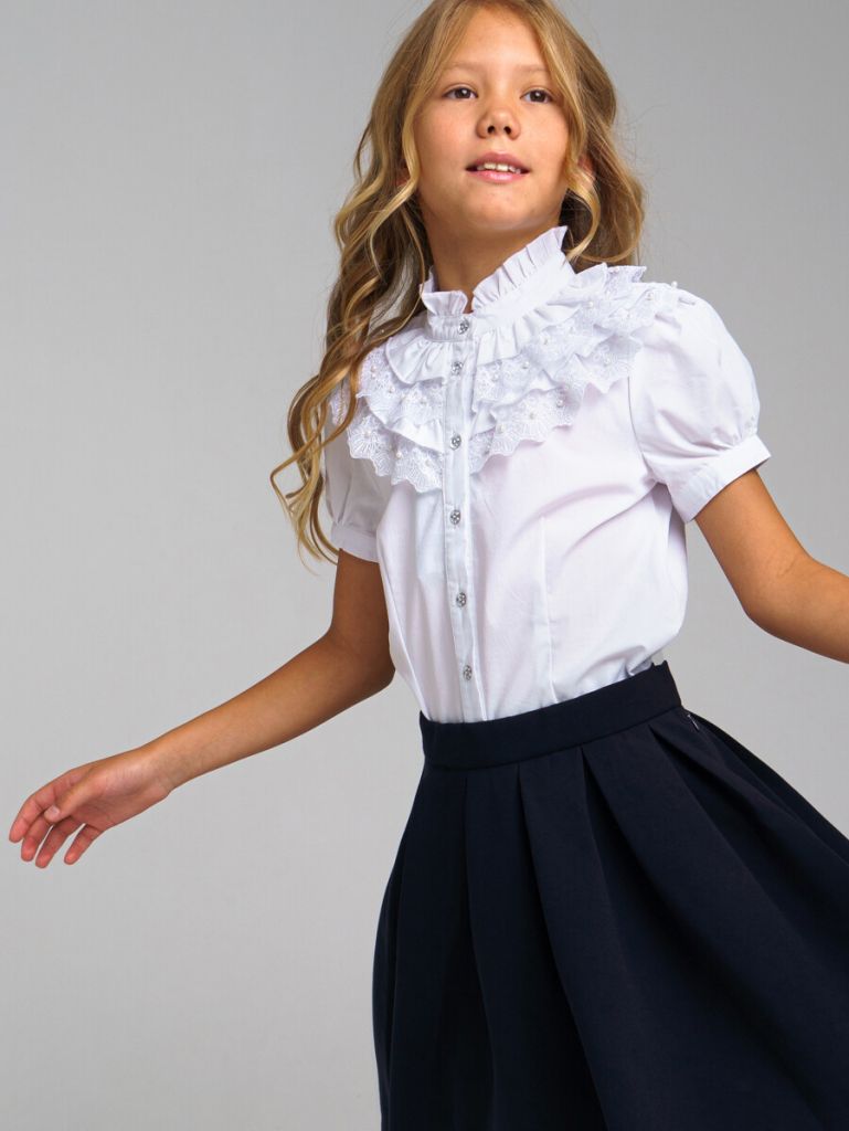 Белая нарядная текстильная блузка прямого силуэта, приталенная для девочки подростка. Школьная блузка на пуговицах хорошо держит форму, комфортна в носке и проста в уходе. Высокое содержание хлопка. Рубашка в школу с коротким рукавом разнообразит повседневные школьные образы.