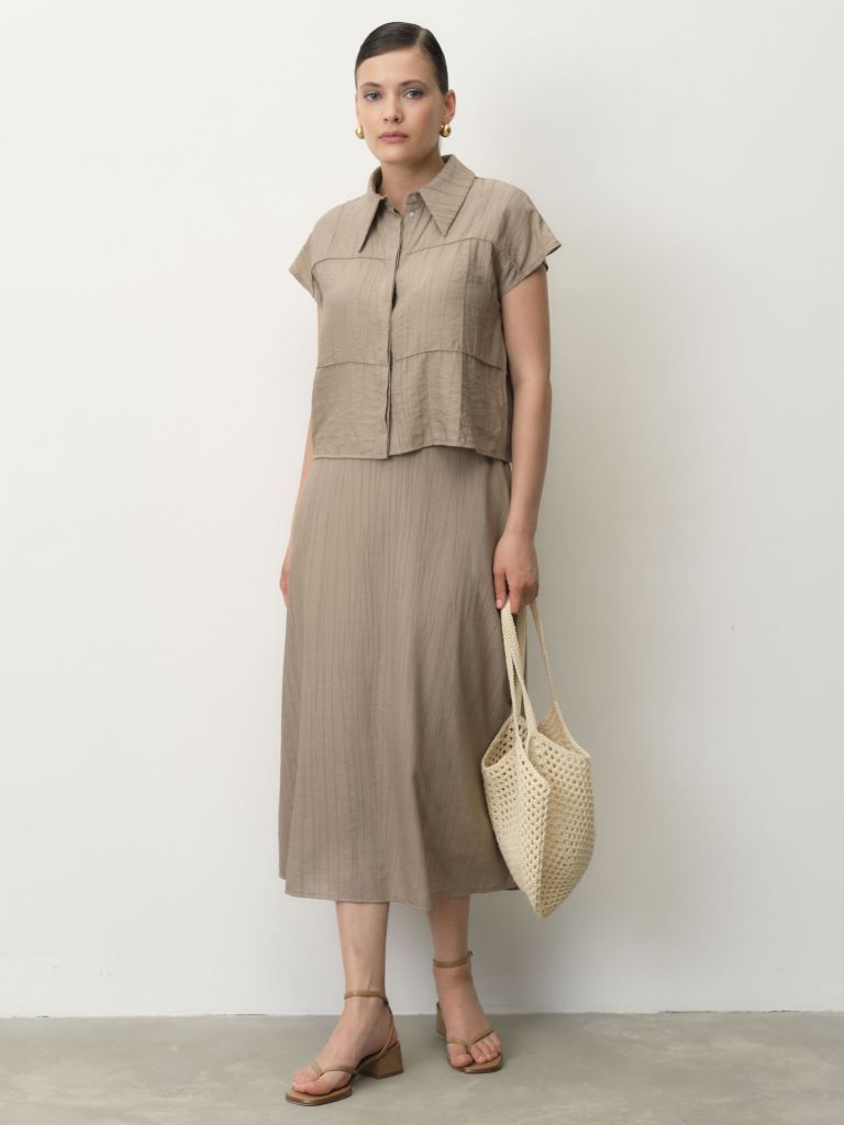 Стильная коричневая блуза из вискозы — гармоничное сочетание комфорта, элегантности и практичности. Натуральный материал придаёт изделию мягкость, лёгкость и струящийся силуэт, подчёркивая женственность и утончённый вкус. Тёплый коричневый оттенок придаёт образу глубину и благородство, делая блузу универсальной Прямой крой подойдёт для любого типа фигуры, а лаконичный дизайн легко впишется в деловой или повседневный гардероб.Преимущества вискозы:Воздухопроницаемость и комфортНатуральная мягкость и гладкостьПриятна к телу, подходит для чувствительной кожиПодчёркивает фигуру, не стесняя движенийОтлично сочетается с брюками нейтральных тонов, светлыми джинсами, юбками миди и аксессуарами. Добавьте обувь на каблуке — и образ заиграет по-новому.Размерная сетка