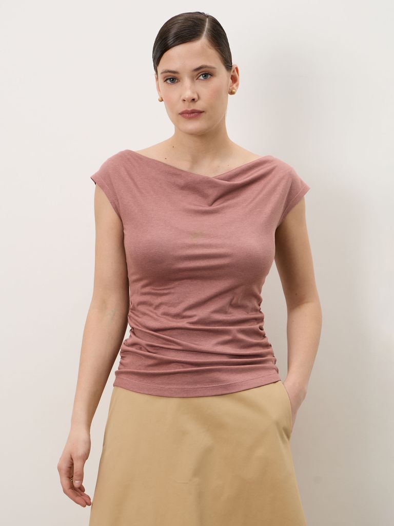 Приталенный силуэт с естественной посадкой. Горловина оформлена мягкой драпировкой, которая создаёт плавные складки. Боковые сборки добавляют рельеф и подчёркивают фигуру, не создавая ощущения стеснения.