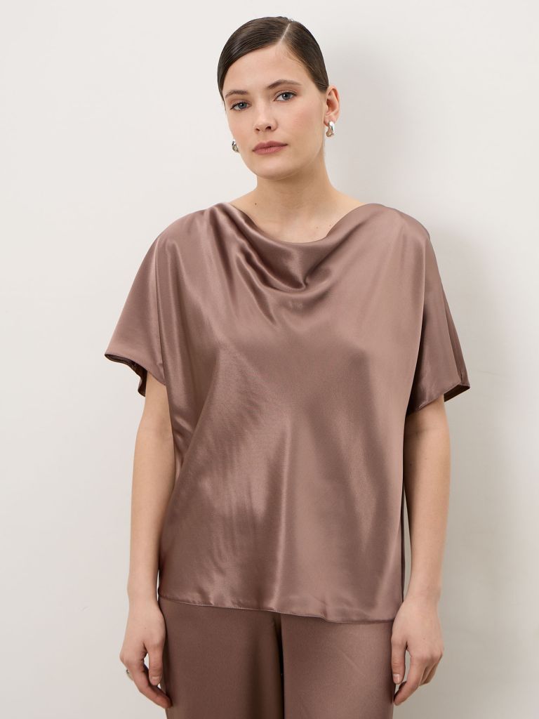 Свободный силуэт с мягкой линией плеча и лёгкой драпировкой у горловины. Крой не ограничивает движения и создаёт расслабленный, собранный образ. Минимализм в деталях делает модель вне времени.